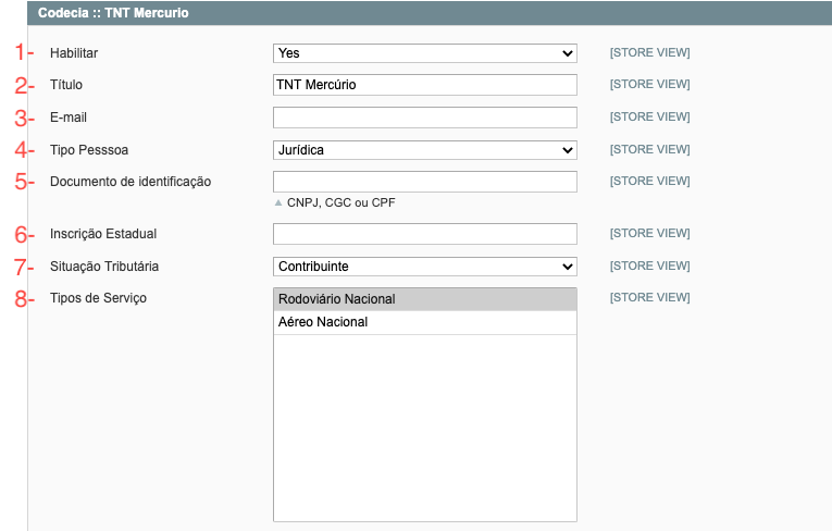 Acesse o painel do Magento em SISTEMA -> CONFIGURAÇÃO -> MÉTODOS DE ENVIO e na aba CODECIA :: TNT MERCÚRIO, preencha os seguintes campos com as configurações necessárias.